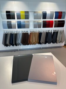ショールームの奥のカラーサンプルパネルにて